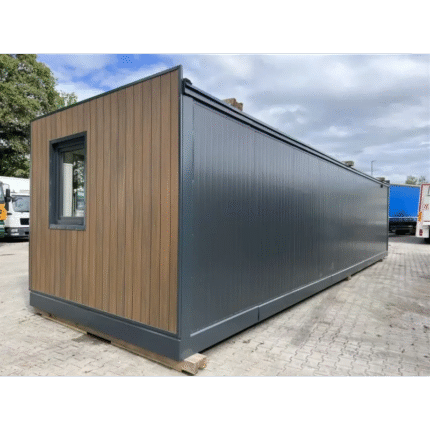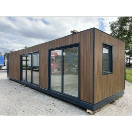 Descripción ‘- Dimensiones (LxAnxAl): 11 m x 3,5 m x 3 m – Alto aislamiento – Marcos de ventanas de plástico con cristal termopanel – Distribución: salón con cocina, dormitorio grande independiente, dormitorio adicional, cuarto de baño – 2 ventanas oscilobatientes – 1 puerta al exterior y 2 grandes ventanas correderas a la terraza – Cocina equipada con frigorífico, vitrocerámica y campana extractora – Suelo de PVC – Calefacción eléctrica – Termo eléctrico – Armario de contadores, iluminación y tomas de corriente – Toma de agua potable / desagüe exterior – Inodoro, ducha de lujo y lavabo/mueble – Acabado de plástico que no requiere mantenimiento – Robusta construcción totalmente de acero ¡Simplemente instale, conecte y empiece a vivir o residir inmediatamente!